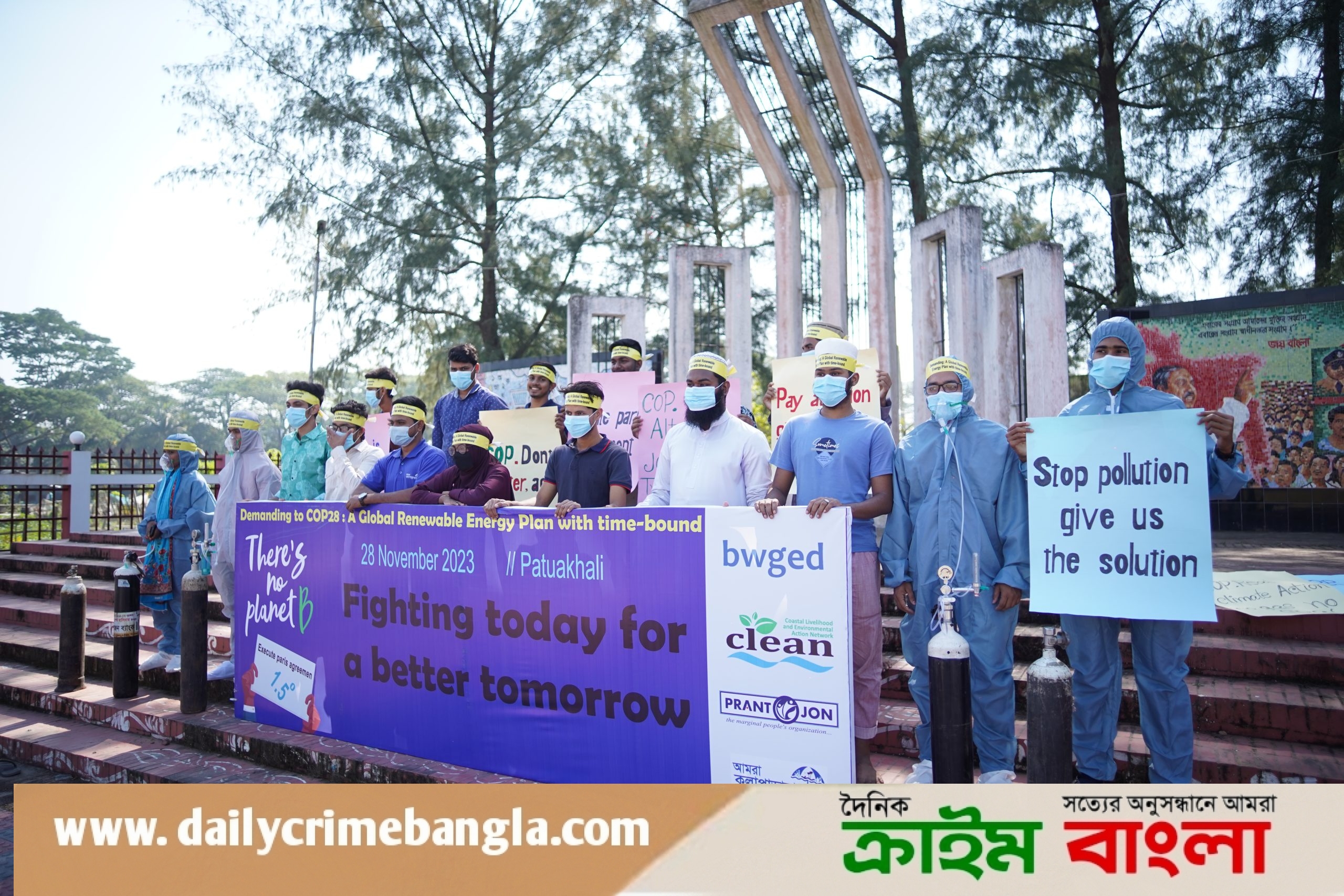 ফেস্টুন। এ সময় পিপিই ও মাস্ক পড়ে ভবিষ্যৎ বাংলাদেশের বায়ু ও পরিবেশ দূষণের ভয়াবহতা প্রতিকি তুলে ধরা হয়।