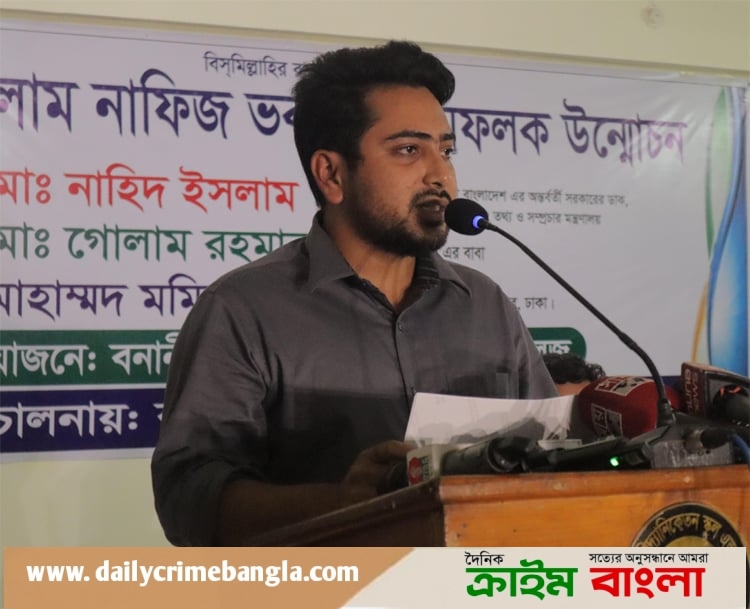 আজ রাজধানীর বনানী বিদ্যানিকেতন স্কুল এন্ড কলেজে শহিদ গোলাম নাফিজ ভবনের নামফলক উন্মোচন অনুষ্ঠানে প্রধান অতিথির বক্তৃতায় ডাক, টেলিযোগাযোগ ও তথ্যপ্রযুক্তি উপদেষ্টা মো. নাহিদ ইসলাম একথা জানান।