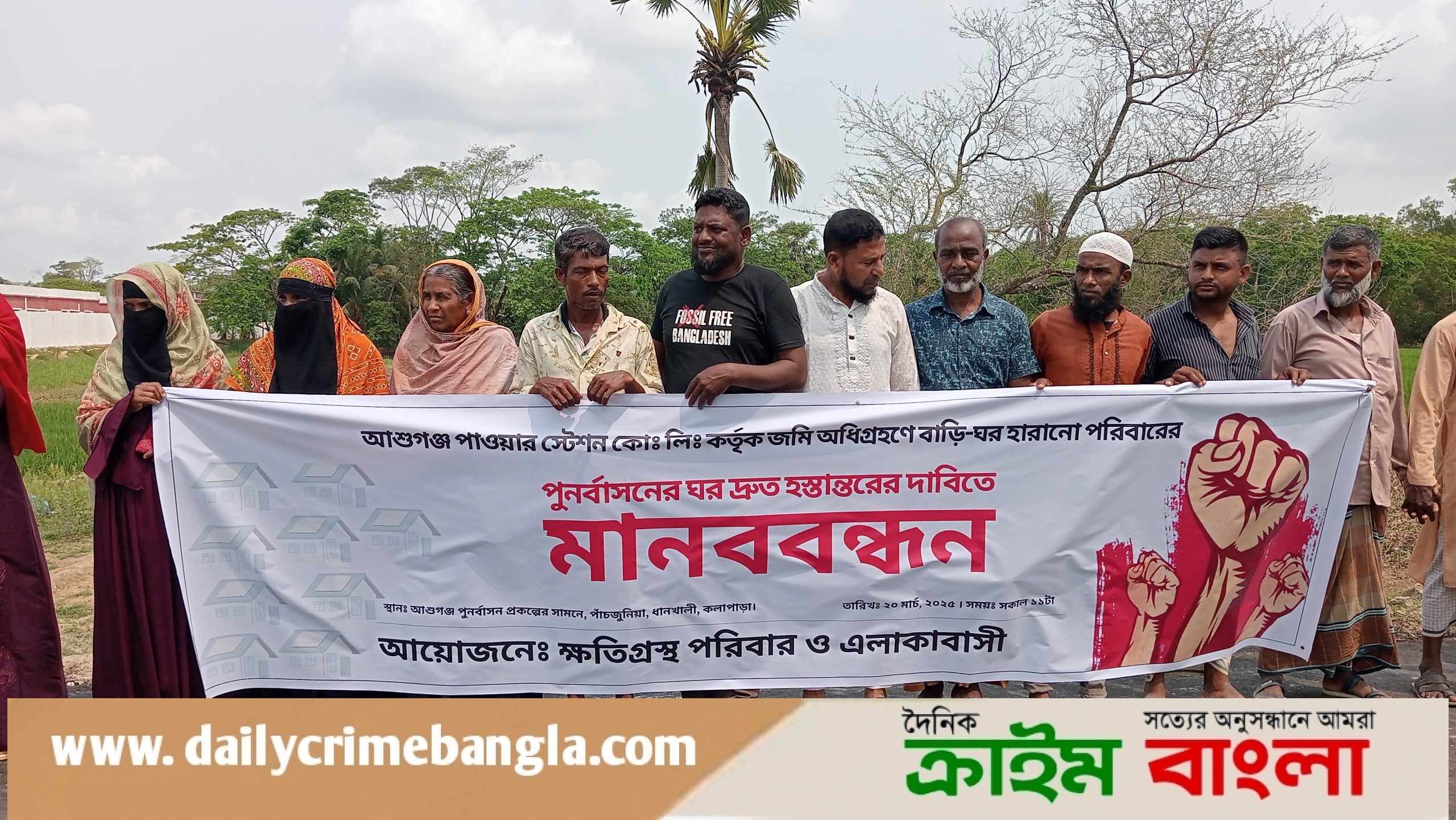 আশুগঞ্জ পাওয়ার স্টেশন কর্তৃক জমি অধিগ্রহনে বাড়ি-ঘর হারানো পরিবারের পুনর্বাসনের ঘর দ্রুত হস্তান্তরের দাবিতে মানববন্ধন ও বিক্ষোভ মিছিল করেছে ক্ষতিগ্রস্থ পরিবারের সদস্যরা। বৃহস্পতিবার বেলা এগারোটায় কলাপাড়া উপজেলার ধানখালী ইউনিয়নের পাঁচজুনিয়া গ্রামের আশুগঞ্জ পুর্নবাসন প্রকল্পের সামনে এ মানববন্ধন অনুষ্ঠিত হয়। এসময় বক্তব্য রাখেন ক্ষতিগ্রস্থ পরিবারের সদস্য খবির মোল্লা, মামুন মৃধা, গাজী হাফিজুর রহমান পিন্টু, সীমা বেগম ও হুমায়ুন মোল্লা। শেষে বিক্ষোভ মিছিলটি ওই এলাকার প্রধান প্রধান সড়ক প্রদক্ষিন করে।
