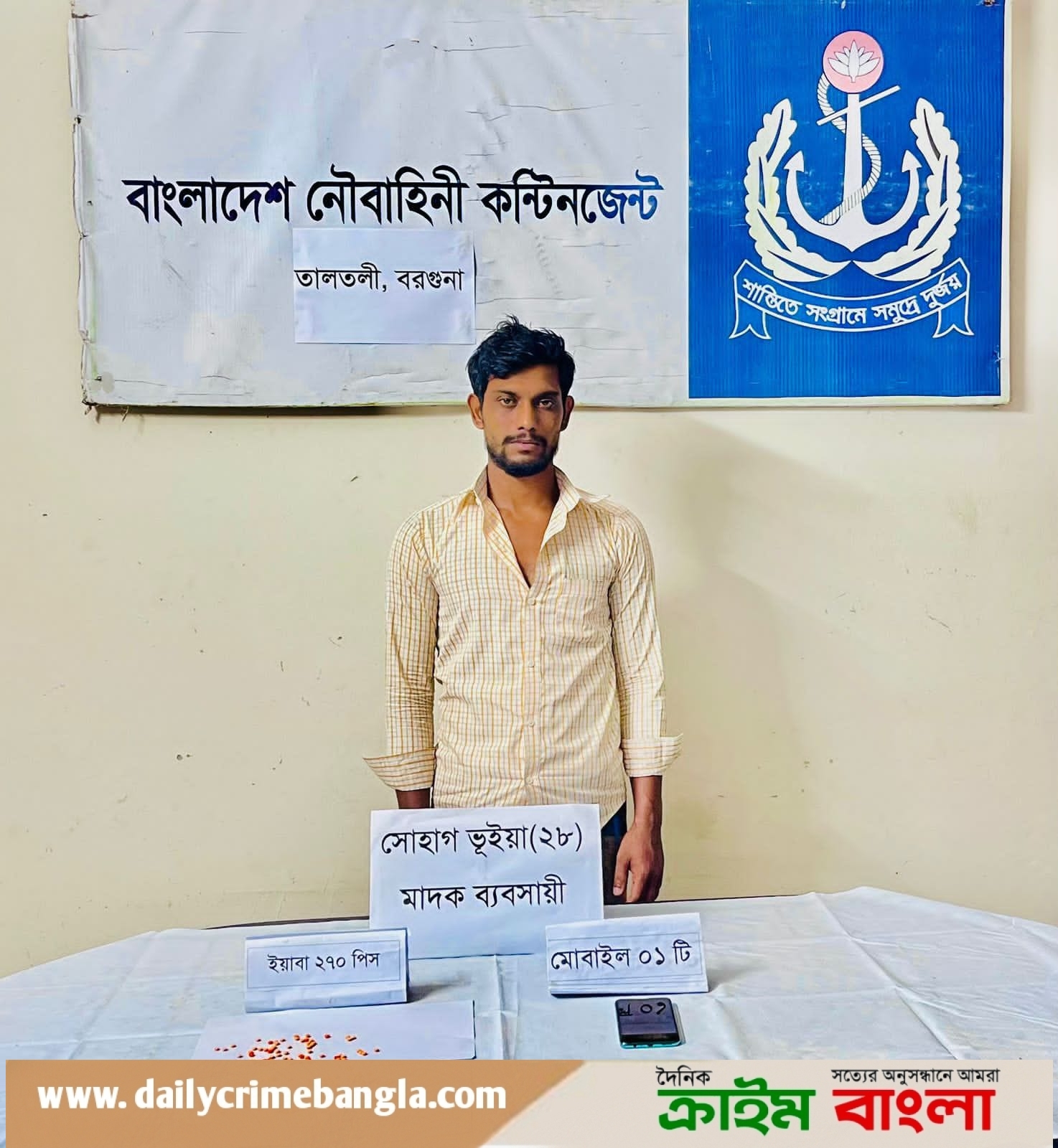 নৌবাহিনী অভিযানে বরগুনার তালতলিতে চিহ্নিত একজন মাদক ব্যবসায়ী আটক করা হয়েছে। দেশের আইন-শৃঙ্খলা পরিস্থিতি সুদৃঢ় রাখা এবং অপরাধমূলক কার্যক্রম প্রতিরোধে দায়িত্বপ্রাপ্ত একালাসমূহে নিয়মিত অভিযান পরিচলনা করছে বাংলাদেশ নৌবাহিনী। এরই ধারাবাহিকতায় গতকাল শনিবার (৪ অক্টোবার) রাতে তালতলী উপজেলাধীন কড়াইবাড়িয়া বাজার হতে নৌ গোয়েন্দা তৎপরতায় ও গোপন তথ্যের ভিত্তিতে মোঃ সোহাগ ভূইয়া (২৮) কে আটক করা হয়। পরবর্তীতে উক্ত ব্যক্তির মোটরসাইকেল ও হেলমেট তল্লাশি করে ২৭০ পিস ইয়াবা পাওয়া যায়।