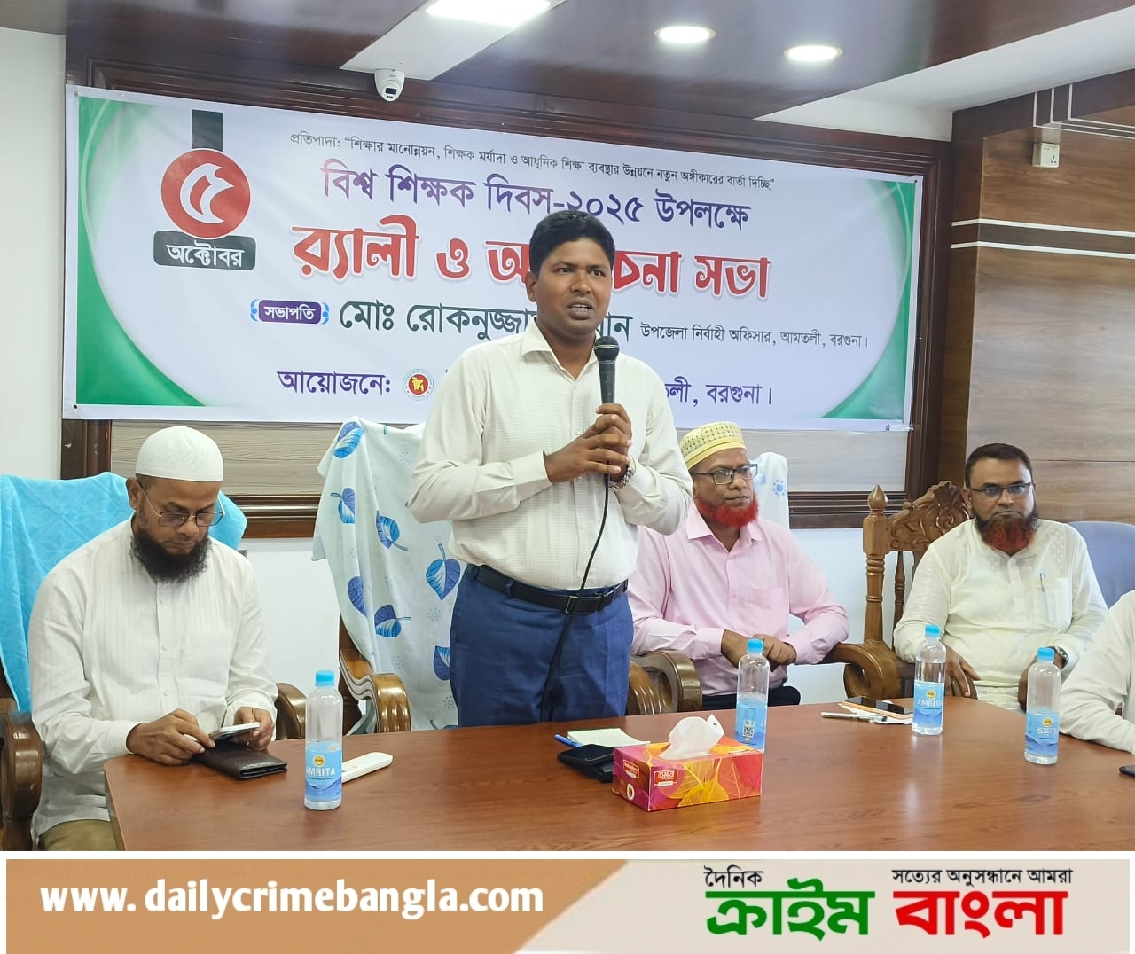 আমতলীতে র্যালী ও আলোচনা সভার মধ্যে দিয়ে রবিবার সকাল ১১ টায় বিশ্ব শিক্ষক দিবস পালিত হয়েছে। আমতলী উপজেলা পরিষদ চত্ত্বও থেকে এক বর্নাঢ্য র্যারী শহর প্রদক্ষিণ করে। পরে পৌরসভার হল রুমে এক আলোচনা সভা অনুষ্ঠিত হয়।
