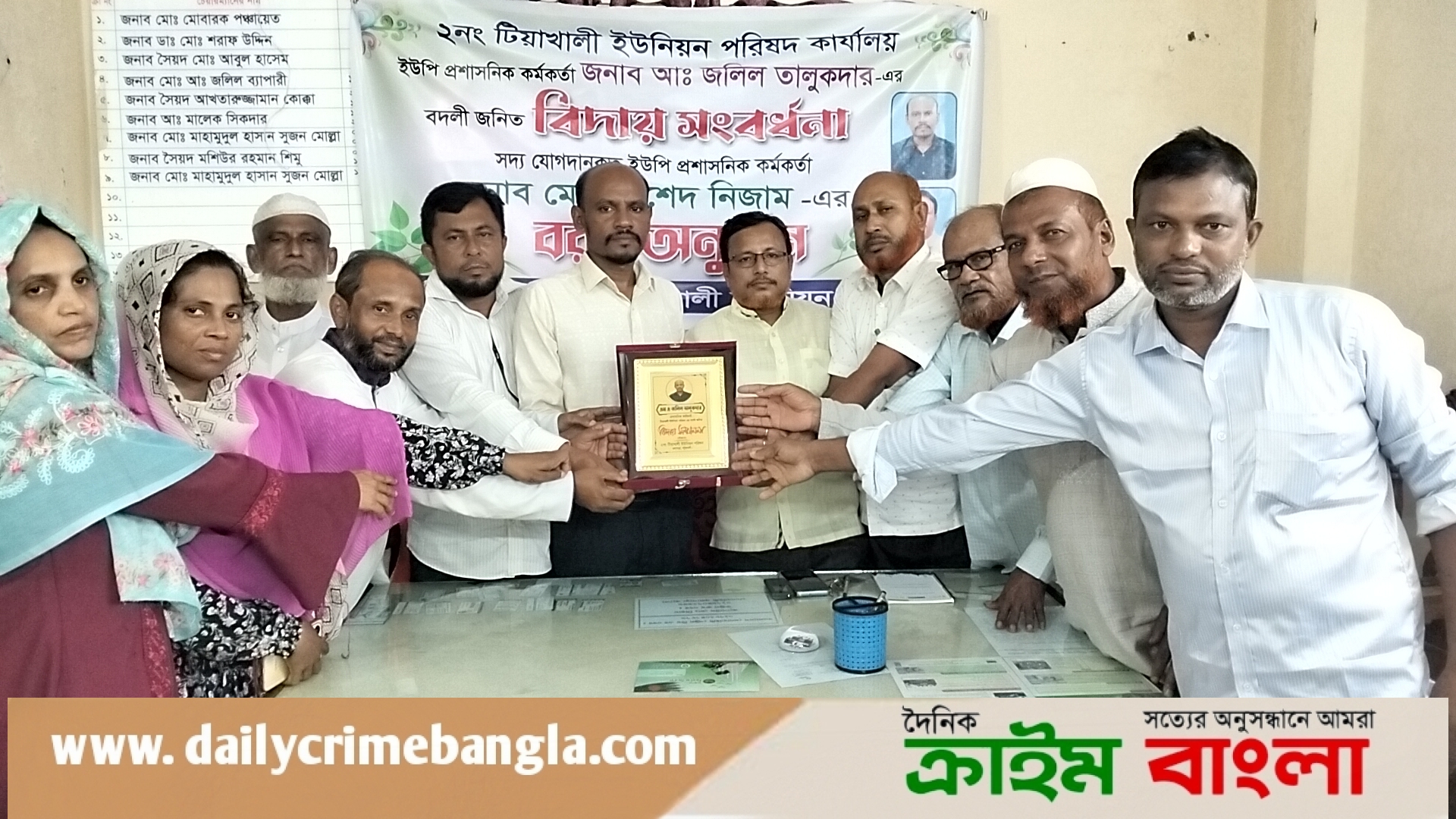 কলাপাড়া উপজেলার টিয়াখালী ইউনিয়নের প্রশাসনিক কর্মকর্তা এম এ জলিল তালুকদারের বদলিজনিত বিদায় সংবর্ধনা অনুষ্ঠিত হয়েছে। একই সাথে সদ্য যোগদানকৃত প্রশাসনিক কর্মকর্তা মো. রাশেদ নিজামকে বরণ করে নেয়া হয়েছে। বৃহস্পতিবার দুপুরে টিয়াখালী ইউনিয়ন পরিষদ মিলনায়তনে এ অনুষ্ঠানের আয়োজন করা হয়।