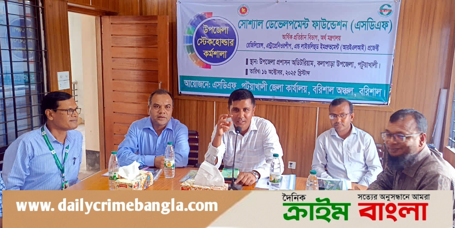 কলাপাড়া (পটুয়াখালী) প্রতিনিধি।। বেসরকারি উন্নয়ন সংস্থা সোশ্যাল ডেভেলপমেন্ট ফাউন্ডেশন (এসডিএফ) এর উদ্যোগে কলাপাড়ায় উপজেলা স্টেকহোল্ডার কর্মশালা অনুষ্ঠিত হয়েছে। এসডিএফ পটুয়াখালী জেলা কার্যালয়ের আয়োজনে বৃহস্পতিবার (১৬ অক্টোবর) বেলা ১১ টায় কলাপাড়া উপজেলা পরিষদ হল রুমে এ কর্মশালা অনুষ্ঠিত হয়। অনুষ্ঠানে সভাপত্বি করেন কলাপাড়া উপজেলা নির্বাহী কর্মকর্তা কাউছার হামিদ। স্বাগত বক্তব্য রাখেন, এসডিএফ পটুয়াখালী জেলা ব্যবস্থাপক মোহাম্মদ আলী। অন্যান্যের মধ্যে বক্তব্য রাখেন, উপজেলা কৃষি সম্প্রসারণ কর্মকর্তা মো: নাহিদ হাসান, উপজেলা সমবায় কর্মকর্তা মো: আব্বাস আলী, উপজেলা সমাজ সেবা কর্মকর্তা, উপজেলা মহিলা বিষয়ক কর্মকর্তা, উপজেলা যুব উন্নয়ন কর্মকর্তাসহ বিভিন্ন সরকারী ও বে-সরকারী দপ্তরের কর্মকর্তাগণ। কর্মশালাটি সার্বিক তত্ত¡াবধান করেন জেলা কর্মকর্তা জীবিকায়ন মো: সাইফুল ইসলাম।
