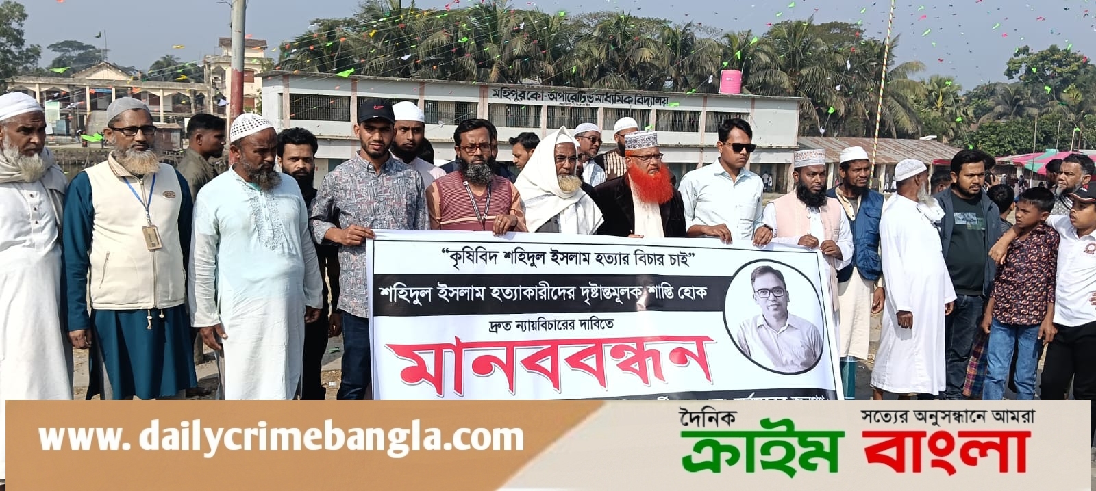 কৃষিবিদ শহিদুল ইসলাম হত্যাকাণ্ডে জড়িতদের দ্রুত গ্রেফতার ও দৃষ্টান্তমূলক শাস্তির দাবিতে পটুয়াখালীর কলাপাড়া উপজেলার মহিপুরে মানববন্ধন ও বিক্ষোভ মিছিল অনুষ্ঠিত হয়েছে।