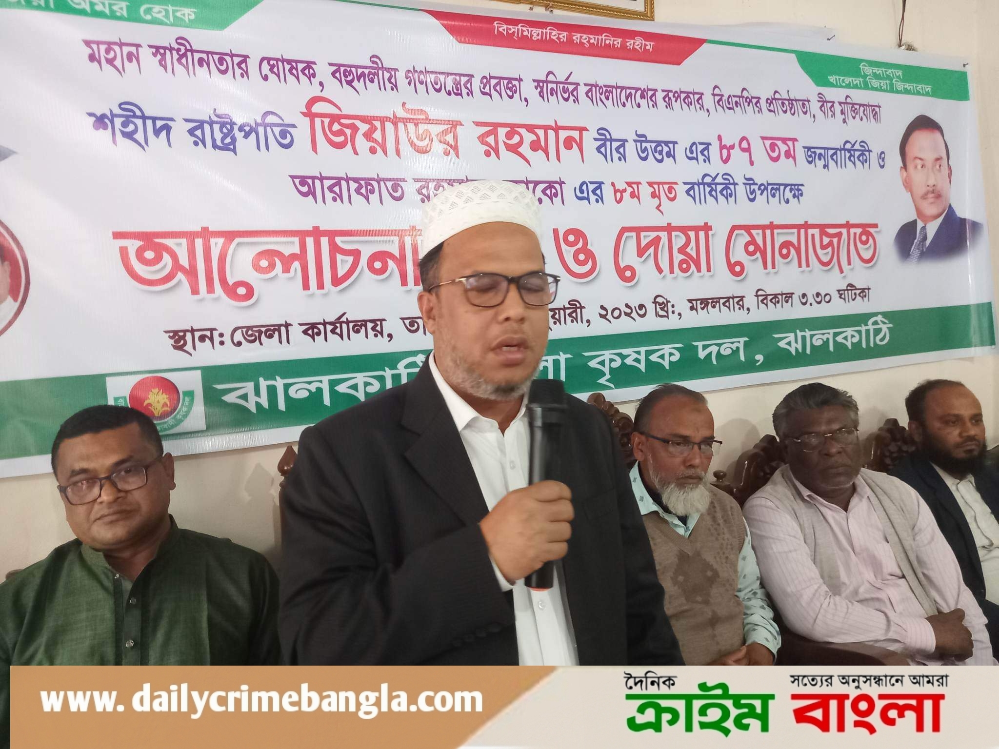 ঝালকাঠি প্রতিনিধি॥ ঝালকাঠিতে জাতীয়তাবাদী কৃষকদল জেলা শাখার উদ্যোগে বিএনপি’র প্রতিষ্ঠাতা শহীদ রাষ্ট্রপতি জিয়াউর রহমানের ৮৭তম জন্মবার্ষিকী ও আরাফাত রহমান কোকোর ৮ম মৃত্যুবার্ষিকী উপলক্ষে আলোচনা সভা ও দোয়া মিলাদের আয়োজন করা হয়েছে। মঙ্গলবার (২৪ জানুয়ারী) বিকালে বিএনপি’র জেলা কার্যালয়ে জেলা কৃষক দলের সভাপতি মো: তকদীর হোসেনের সভাপতিত্বে প্রধান অতিথি ছিলেন জেলা বিএনপি’র সদস্য সচিব অ্যাডভোকেট শাহাদাৎ হোসেন। এ সময় বক্তব্য রাখেন জেলা বিএনপি’র অন্যতম সদস্য অ্যাডভোকেট মিজানুর রহমান মুবিন, সদর উপজেলা বিএনপি’র সাধারণ সম্পাদক মো: খোকন মল্লিক, যুবদলের সিনিয়র যুগ্ম আহ্বায়ক রবিউল হোসেন তুহিন, জেলা যুবদলের সদস্য সচিব অ্যাডভোকেট মো: আনিচুর রহমান খান, জেলা কৃষকদলের সাধারণ সম্পাদক চাষী মো: নান্না খলিফা, জেলা ছাত্রদলের সাধারণ সম্পাদক গিয়াস সরদার দীপু, জেলা জিয়া মঞ্চের আহ্বায়ক মো: আজিজুর রহমান বশির, কৃষক দল জেলা সাংগঠনিক সম্পাদক সাইফুল হক টুটুল, জেলা মহিলা দলের সাংগঠনিক সম্পাদক শারমিন লেলিন মুক্তা, কৃষক দল নেতা গোলাম ফারুক মোল্লা, মো: হুমায়ূন কবির, বাবুল মিনা, মো: মজিবর রহমান, মো; শামিম মল্লিক, শহিদুল ইসলাম খোকন, মোস্তফা কামাল মিন্টু, মো: হাফিজ মল্লিক, মো: বাবু হাওলাদার, মো: ইয়াসিন হাওলাদার প্রমুখ।